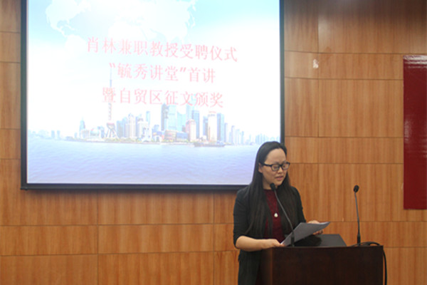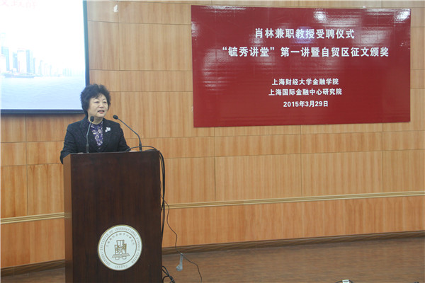 樊丽明校长代表学校,对肖林主任能够担任我校的兼职教授表示感谢。樊校长表示,能够请肖林主任做我校的兼职教授,这体现了上海财经大学的师资队伍要专兼职结合这样一种办学理念。我们的创校校长郭秉文先生把我们学校1921年带到上海的时候,有一句话“人才和环境的原因,南京高等师范学校的商科要到上海来”,这里的人才,首先就是师资,然后是培养的人才要在一定环境里面去实习、去学习。办财经院校,我们的教师队伍本来就应该是专兼职结合,吸纳在学校和业界,或在其他岗位上从事经济管理研究与实践的老师。樊校长肯定了金融学院创设“毓秀讲堂”是一项有益于同学们成长的举措,契合我校历来所倡导的扎实的学风、开放的思维、务实的品格,期待着未来每个学院都能够形成自己的品牌项目。同时,樊校长指出,自贸区话题实质上集合了中国在当下这样一个阶段的热点和难点,中国的深化改革、中国的扩大开放、中国的发展突破都包含其中,希望大家通过自贸区征文比赛等活动积极开展多种形式的探索与思考。