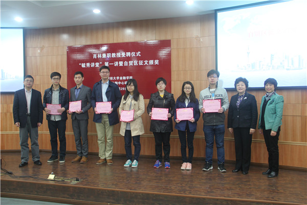 随后,樊丽明校长、肖林主任、赵晓菊院长共同为自贸区征文获奖代表颁发证书。