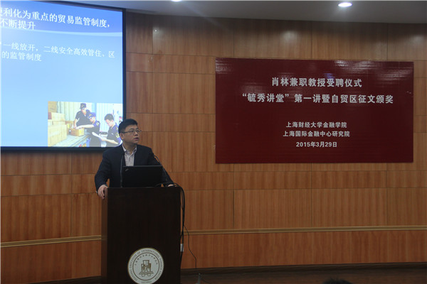 3月29日上午,肖林兼职教授受聘仪式、“毓秀讲堂”第一讲暨自贸区征文颁奖在武东路校区同德楼一楼报告厅举行。本次活动由中国(上海)自由贸易试验区协同创新中心、上海财经大学金融学院、上海国际金融中心研究院联合主办。上海财经大学校长樊丽明、上海市政府发展研究中心主任肖林、上海国际金融中心研究院执行院长赵晓菊、金融学院常务副院长刘莉亚、科研处副处长魏航、金融学院院长助理陈利平等出席。樊丽明校长在会前同肖林主任就进一步加强合作等方面事宜进行了交流。会议由金融学院常务副院长刘莉亚教授主持,150余名师生参与活动。