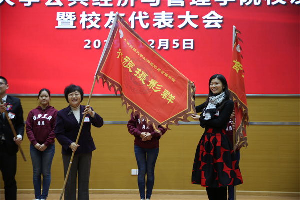 随后,樊丽明校长、方华副校长共同为“上海财经大学公共经济与管理学院校友会”揭牌。伴随着冲锋号角的激昂音乐,樊丽明校长将印有“人文读书群”、“音乐体育群”、“行旅摄影群”及“美食群”的四面古战旗,亲自授予了公管校友会各俱乐部群主,高昂的战旗瞬间挥舞起校友们青春的激情。