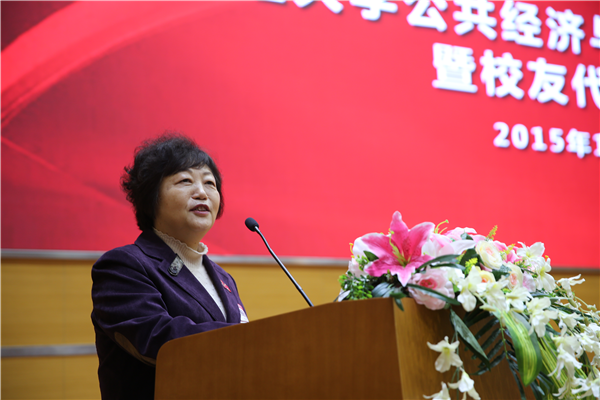 樊丽明校长在成立大会上发表了热情洋溢的致辞。她说,公管学院校友会成立是学校和广大校友、师生的一件喜事,是学校发展历史上非常有意义的一件盛事。在向与会校友简要介绍学校98年来的辉煌历程,特别是近年来的发展情况后,樊校长指出,校友是学校发展的推动者和学校历史的缔造者。每一次的发展和成就的取得都倾注着一届又一届校友的青春热血,凝结着他们的智慧力量。她希望公管学院校友会成为凝聚校友、交流信息和合作发展的平台,并号召各地校友共同努力,在全国乃至全世界范围内建立健全校友会组织建设,为将母校建设得更加美好而努力,为社会的发展进步做出更大的贡献。