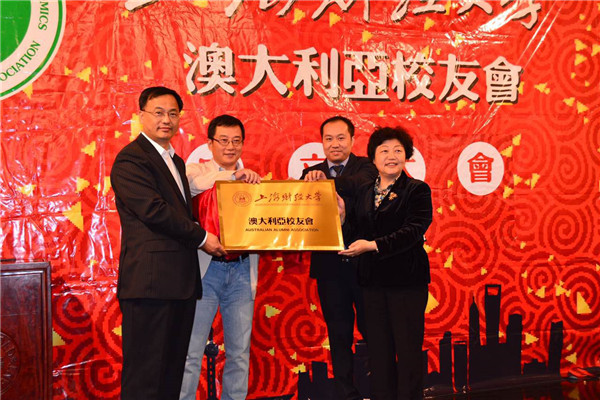 樊丽明校长与澳大利亚校友会会长阎敏共同为“上海财经大学澳大利亚校友会”揭牌。樊校长向澳大利亚校友会赠送“上海财经大学----历史印记”各时期校门丝质织锦画。