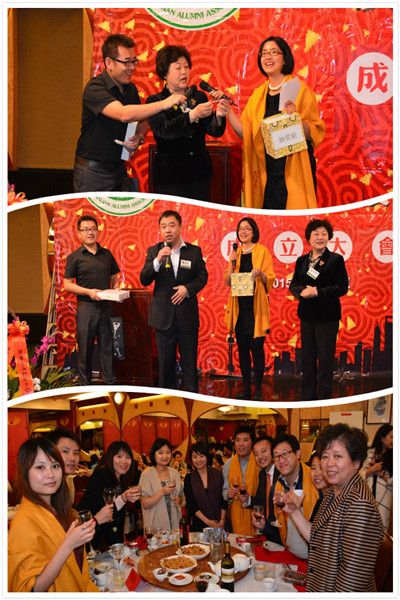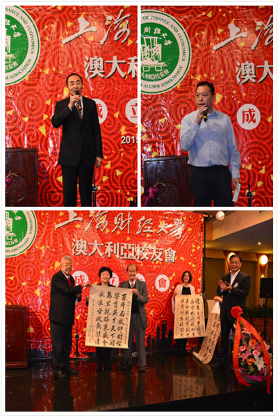 晚宴中,老校友代表94岁的黄庆辉老先生发言并向澳大利亚校友会赠送亲笔书写的对联和诗。香港校友会梁建昌会长,南京校友会吴亚东会长,中国澳大利亚领事馆刘文武领事,澳大利亚中国大学校友会联盟封启洪主席分别上台发言并对上海财经大学澳大利亚校友会的成立表示祝贺。