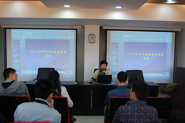 为了深入学习领会党的十八届四中全会精神,11月11日中午,国际工商管理学院在学院206会议室召开学习贯彻十八届四中全会精神专题报告会,学院全体师生党员以及体育教学部的党员参加了本次学习。报告会特邀我校法学院王士如教授作专题解读,由学院党总支副书记薛亮主持。