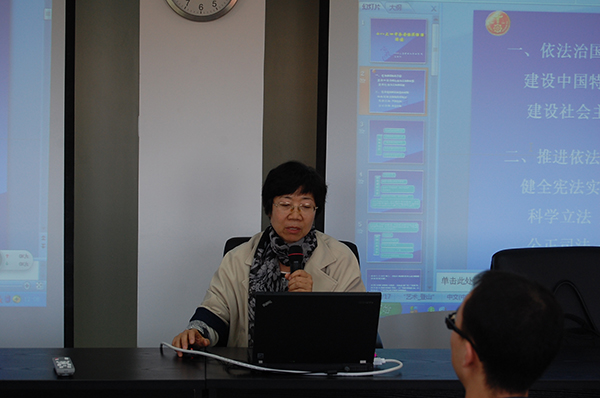 在整个报告讲述过程中,王教授紧紧围绕十八届四中全会上提出的全面推进依法治国的核心思想,分别从完备的法律规范体系、高效的法治实施体系、严密的法治监督体系、有力的法治保障体系及完善的党内法规体系等几个方面对中国特色社会主义法治体系建设进行了全面阐述。她通过生动案例,形象生动、深入浅出地讲解了依法治国的理论意义和现实意义,对学院的党员师生学习、领会十八届四中全会精神起到了重要作用。 通过本次专题报告会,学院广大党员老师和学生更加深刻地了解到学习党的十八届四中全会精神的重要意义,进一步了解了现阶段实施依法治国战略的重要性和紧迫性,也对大家不断增强法治思维和法律意识,提高政治素养,起到了进一步的推动作用。