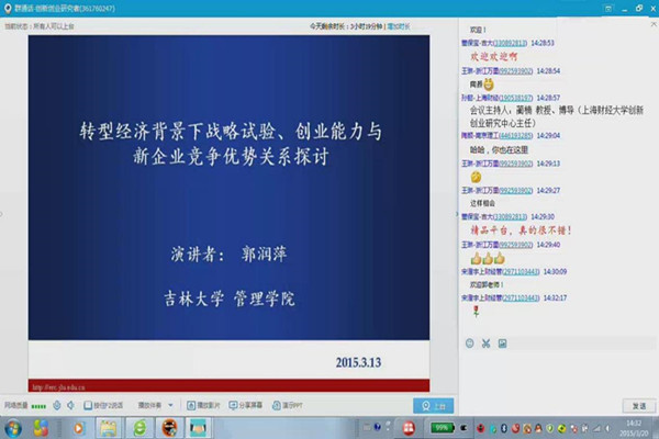 本次活动由《外国经济与管理》“创业和创新”栏目策划,上海财经大学创新创业研究中心主任蔺楠教授主持,吉林大学郭润萍博士作主题论文演讲,吉林大学费宇鹏教授为主题论文点评,吉林大学董保宝副教授、桂林理工大学李雷博士和华南理工大学苏德贵博士分别作工作论文演讲。该领域30余名学者通过网络平台进行了90分钟精彩研讨。