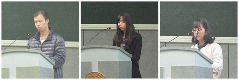 接下来,三位学员代表进行发言。来自国际工商学院的预备党员代表曹程同学首先发言,他表示作为一名预备党员,必将做到严以修身、严以律己、严以奉献,以实际行动做一名合格且优秀的共产党员。学生发展对象学员代表——法学院陈宇婧同学上台发言,她感谢了学校给予了如此宝贵的学习机会,表示必将努力加强理论学习,树立坚定的共产主义理想信念。教工学员代表,来自人事处的张淼老师则回顾了在开学典礼上章老师提出的“四点要求”,表示一定勤奋学习、多思多想,学习红色经典,学习习总书记重要讲话精神,以“活到老、学到老”作为毕生追求。之后宣布本期党校获奖名单并为获奖同学一一颁发荣誉证书。