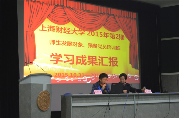 结业典礼在庄重的国歌声中开幕。首先,来自会计学院的何立同学代表全体学员作学习成果汇报。何立同学对本期党校培训内容与学员风采做了精彩展示,从学员小组长的岗前培训,到对师生预备党员培训班开展的《中国共产党的奋斗业绩与基本评价》等系列报告以及师生发展对象培训班进行的《今天我们怎样解读<共产党宣言>》等教学环节的回顾,再到对中国人民抗日战争暨世界反法西斯战争胜利70周年专题纪录片的观看、反思,小组讨论及学员答辩,参观陈云故居实践活动等等。本期党校培训学习的内容充实丰富,使学员不仅收获了丰富的理论知识,更能将理论知识更好地运用于实践中。