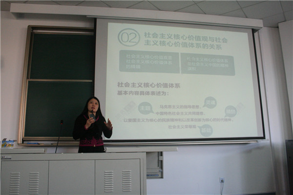刘光峰老师以十八届四中全会精神为主旨,全面剖析了依法治国与社会主义核心价值观之间的内在联系。首先,她从大量的历史案例入手,解读了经济发展与价值观之间的关系,进而论证社会主义核心价值观的重大意义。其次,深刻分析了十八届四中全会的内容,概况为:一个目标,五个体系,六大任务。并指出此次会议成果的亮点是:依法治国,首先是依宪治国,建立领导干部干预司法活动,插手具体案件处理的记录、通报制度等等。