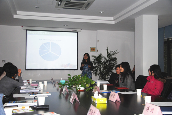 随后,2010级工商管理专业的于隽璇同学介绍了自己在加拿大女王大学的交换经历,着重介绍了其选修的通识课程“心理学概论”,包括其课程架构、学时、授课方式等等。她说到,心理学概论这门课共有1500多人上课,分三个时间段即周一、周二和周三晚间进行,方便学生根据自己的时间听课。另外,这门课安排了来自心理学5个不同领域的老师轮流授课,方便学生多方面获取知识。同时,她提到,为了方便学生课后咨询,女王大学设立了一些学生服务机构,如学习战略(learning strategies), 写作中心(writing center) 及互助小组(peer mentor)。
