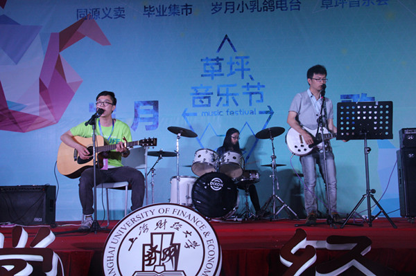 下午的武东操场更是热闹非凡。毕业集市上毕业生们尝试练摊,出售自己的二手闲置物品,同时大家也通过支教团、淘来淘趣和牵手社将自己的书本、衣物捐献给需要的人。与此同时进行的岁月小乳鸽电台也开始为晚会预热,大家通过电台点播了一曲曲充满回忆的歌曲,用歌声传递大家的心意。同源爱心基金义卖活动也在场内同期开展,众多老师同学纷纷献出自己的爱心。 傍晚18时30分,毕业季草坪音乐会在武东大操场上激情上演。同学们早早来到现场,或坐或立,静候开场。毕业生自己选择歌单,并亲自演绎这些歌曲,在夜色下操场上唱响那些曾经爱过的歌曲。活动现场气氛热烈,笑声、掌声、歌声不断。来自教工舞蹈团的老师也为大家献上了精心准备的爵士舞表演,动感舞蹈和曼妙身姿引起了现场观众的阵阵喝彩,将音乐节的气氛带向高潮。 音乐会结束后,老师同学们移步红瓦楼下,期待着即将开始的亮灯仪式。21时在现场百余名师生洪亮的倒数声中,红瓦楼的灯光闪亮,出现了“SUFE”字样,现场的同学们纷纷发起惊呼,用手机和相机记录下了这一精彩难忘的画面。 此次的草坪音乐节系列活动为上海财经大学2015毕业季拉开序幕,校园内洋溢着浓浓的毕业氛围,这是同学们对上财的由衷热爱,也是对毕业的不舍与眷恋。