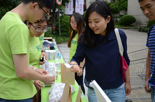 中午11时,“爱之大同,源自一家”——同源爱心基金义卖活动率先在绿叶步行街启动。岁月如歌明信片、SUFE定制风扇、手环、胶带、笑脸别针、SUFE定制糖果,一件件充满着青春校园气息的卖品受到了师生们的欢迎,一份份的爱心传递到了校园里的每个角落。义卖所有物品款项均捐至同源爱心基金,用于帮助受困上财校友。