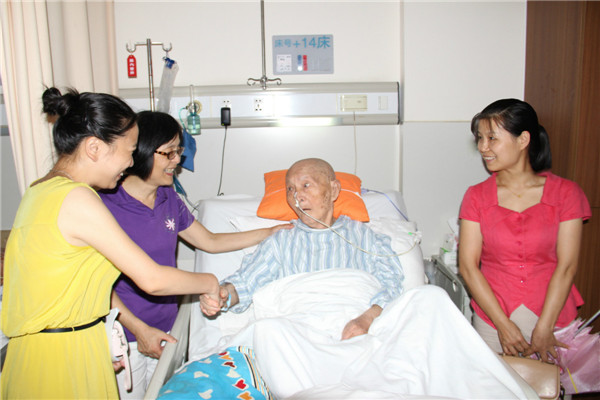 档案馆馆长喻世红代表学校向雍文远教授及其家属表达了学校的关心和祝福,并详细询问了老人的身体状况和生活情况。雍文远教授尽管身体情况不佳,但是仍主动点头示意并与大家一一握手,其女雍华则表达了对学校探访和关心的感谢。