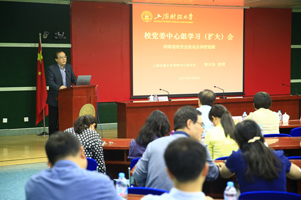 5月6日下午,我校举行校党委中心组学习(扩大)会,邀请上海交通大学保密办公室主任蒋兴浩同志作“网络信息安全挑战及保密提醒”的辅导报告。会议由校党委书记丛树海同志主持,校党政领导、全体中层干部和保密要害部门(部位)工作人员参加了此次学习会。