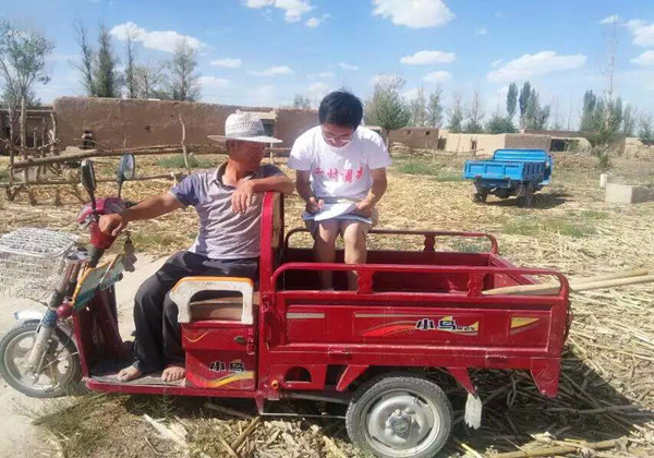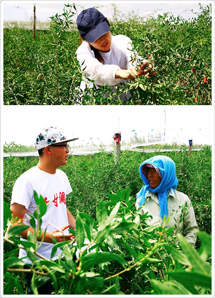 工作熟练了,队员们微信群里的交流也明显增多。房前屋后、田间地头、拖拉机上,牲口棚前都有我们可爱的白T恤的身影。为了不耽误农民的劳作,调研对象在哪里我们就跟到哪里。第六组的杜佳芮和王银同学直接跟进枝条有刺丛生的枸杞园里一边采访一边帮忙摘枸杞。
