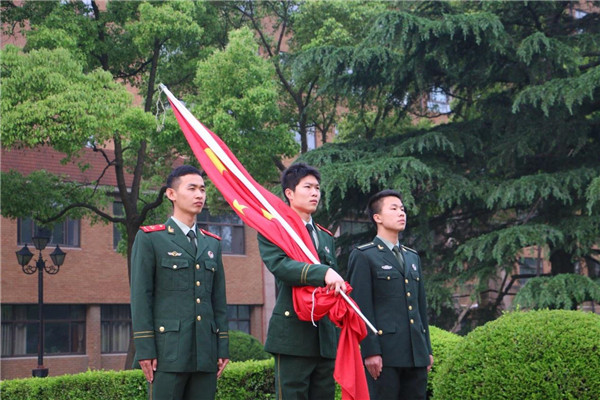 在大家的注视之中,升旗手和护旗手们踏着稳健的步伐,扛着国旗铿锵有力地迈向升旗台。值得一提的是,此次升旗仪式的升旗手与护旗手均来自我校2014年退伍的学生,他们在部队中都曾获得优秀士兵等诸多嘉奖,整齐划一的动作为大家展现了部队青年的风采。