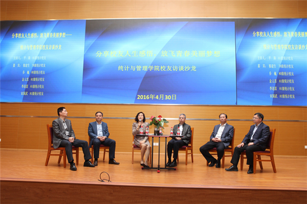 议程第二环节是统计与管理学院校友访谈沙龙活动——“分享校友人生感悟,放飞青春美丽梦想”。81级校友金文忠、李迅雷、宋国武、平瑛,78级统计校友郁建生、80级统计校友乔巍在台上分别分享了自己的人生经历与感悟,为学弟学妹们求学求职提供了独特的见解和指导。