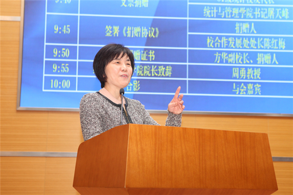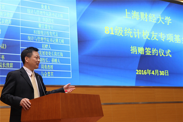 方华副校长在捐赠仪式上首先致欢迎辞。他感谢校友们长期以来对母校的关注和支持,对81级统计校友专项基金的成立表示祝贺。接着,他回顾了学校近年来所取得的成绩,介绍了上财现代化、国际化、信息化的发展特色,展望争创“双一流”的建设目标,并对统计学科未来发展寄予厚望。