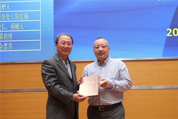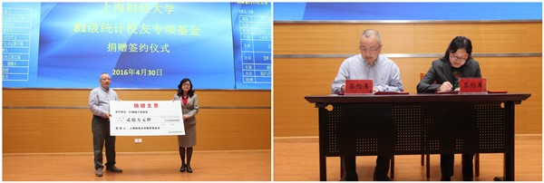 81级统计校友蒋国伟代表81级统计校友向上海财经大学统计与管理学院捐赠20万元专项基金,合作发展处处长陈红梅代表学校与校友代表蒋国伟共同签署捐赠协议,方华副校长为81级统计校友颁发捐赠证书。“上海财经大学81级统计校友基金”由班上29位同学和当年的班主任及辅导员共同捐赠。