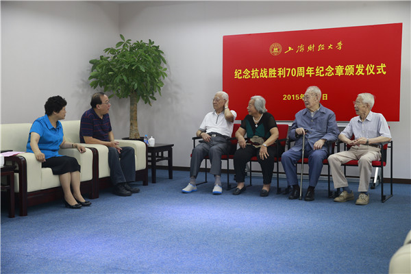 9月7日上午,我校纪念中国人民抗日战争暨世界反法西斯战争胜利70周年纪念章颁发仪式在行政楼三楼隆重举行。校党委书记丛树海、校长樊丽明、校长助理朱鸣雄,抗战老同志,离休干部代表,以及相关部门主要负责人等出席仪式。仪式由朱鸣雄校长助理主持。