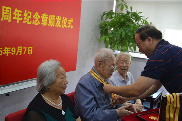 我校有8位老同志获得“中国人民抗日战争胜利70周年纪念章”,他们是:王星九、张婉如、张明文、张淑智、李光治、李毅、陈华、夏斗寅。其中张明文、张婉如、李光治、夏斗寅四位抗战老同志出席了颁发仪式。