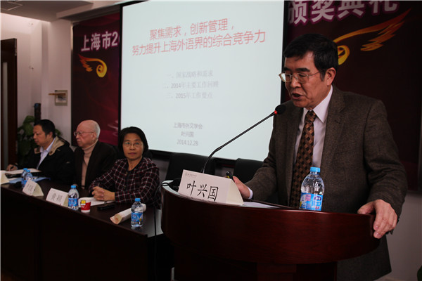 上海财经大学副校长黄颖到会致辞,上海市外文学会会长叶兴国教授作了2014年学会工作总结及2015年学会工作部署。上海外文学会常务副会长史志康教授主持会议。参会人员包括外文学会理事,上海各高校外语学术带头人及外语学院院长。这次会议彰显了上海财经大学外语学科在上海外语界的声誉,获奖人物的学术成就激励外国语学院全体师生,在外语专业领域学习和研究工作精益求精,不断进取。