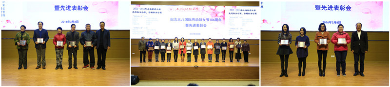 颁奖过程中,获得表彰的个人和集体代表纷纷发表感言,分享了她们学习工作、团队建设、家庭生活等方面的收获和感悟,以及对学校、同事及家人的感谢。会上先后颁发了市、校两级巾帼系列先进个人和集体、比翼双飞模范佳侣、妇女小家等奖项,共有41位个人、22个集体、12对夫妇受到表彰。法学院国际法教研室荣获上海市巾帼文明岗,学术期刊编辑部陆蓉荣获上海市教育系统巾帼建功标兵,国际文化交流学院荣获上海市教育系统巾帼文明岗,信息化办公室陈云、同济大学中德工程学院陈明夫妇荣获上海市教育系统比翼双飞模范佳侣标兵,图书馆妇女小家荣获上海市教育系统优秀妇女小家。