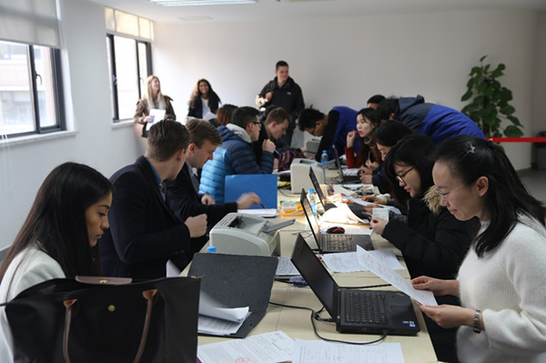 早上8点半开始,留学生三两成群在中外学生志愿者和老师们的热情耐心引导下,有条不紊地开始了一系列的报到注册流程。