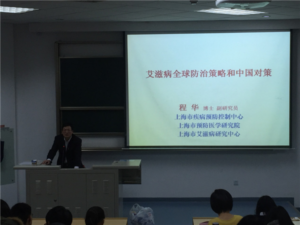 为了能让更多的同学了解到更专业的艾滋病知识,12月6日晚特邀请上海疾病控制中心预防艾滋病专家程华博士为师生做题为《艾滋病全球防治策略及中国对策》的学术讲座。讲座当天,150多名同学顶着严寒来参加我们的讲座,同学们的热情也感染了台上的程华老师,他时而风趣,时而认真的为我们讲述当今全世界的艾滋病疫情,并分析了我国的艾滋病疫情。程华老师立足于艾滋病仍然是影响全球人类健康最大的公共卫生问题这一立场,详细讲述了即使由于缺乏有效的艾滋病预防性疫苗,以及流行传播过程中伴随大量复杂的社会因素,全世界医务人员是如何抗击艾滋病的;而中国作为一个具有14亿人口全球最大的发展中国家,在艾滋病在中国的流行已长达31年的情况下,中国政府为了抗击艾滋病究竟制定了哪些政策和措施才有效地遏制住艾滋病的快速增长;在当今艾滋病经血液和母婴传播途径基本已经控制的情况下,经性接触传播将怎样得到预防。在同学们经久不息的掌声中,程华老师结束了他的讲座,结束后,他还热情的和同学们互动,回答同学们关于艾滋病方面的疑问,让同学们能更清晰直观的了解自己想要知道的关于艾滋病的疑问。