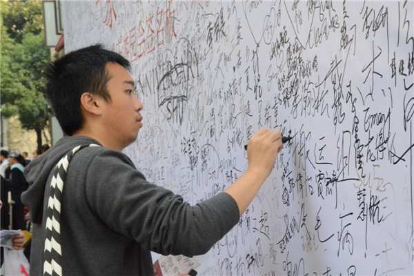 接着,是吸引许多上财学子纷纷驻足的签名板。在签名板上签下大名,告诉周边的树木,告诉脚下的大地:我是财大人,我有财大魂。