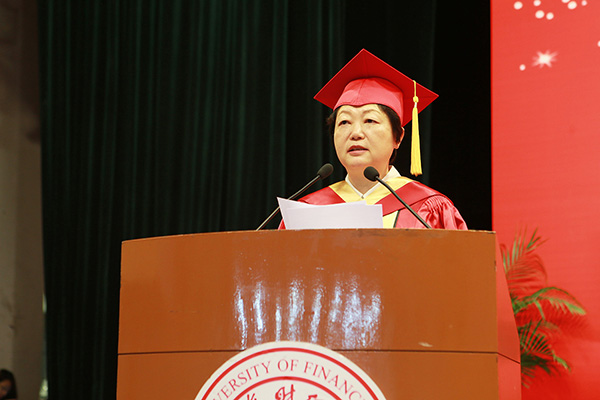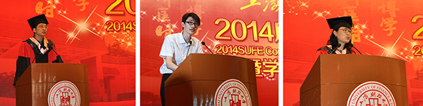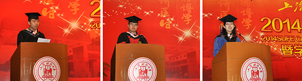 毕业生代表金融学院本科生杨洋、国际工商管理学院博士研究生张远飞、法学院硕士研究生王洋分别发言。他们与毕业生一起回顾了自己的大学生活,一起表达了对同窗、对老师、对母校的眷恋之情,一起祝福母校风发昂扬,英才辈出!他们代表全体毕业生承诺会秉承母校“厚德博学,经济匡时”的校训,做拥有智慧并富有激情的人,做胸怀大志并脚踏实地的人,做德才兼备并勇于创新的人,做严谨负责并敢挑重担的人!