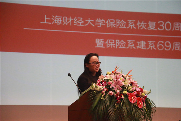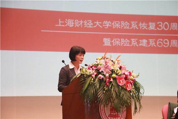 副校长姚玲珍欢迎辞,她代表学校向保险专业恢复30周年、保险校友会的成立表示了祝贺,向30年来为保险专业发展做出贡献的保险系老师、保险业界对上财保险专业的支持表示了感谢。
