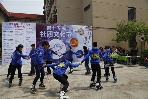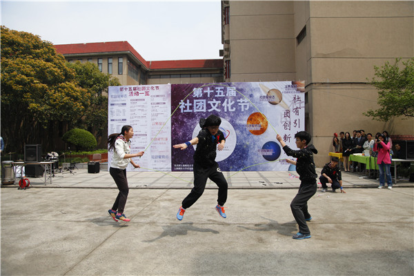 随后,各社团带来了异彩纷呈的节目表演,稻草人户外运动协会社长管凌子同学的脱口秀展现了社团创始人的自由精神,霖泉书画社代表现场泼墨,为文化节题字“十五载,风雨兼程,初心不忘;七八社,同舟共济,始终方得”。风之符口琴社与吉他社一同演奏的一曲《同桌的你》动人心弦。P.C.M魔术协会的吞针表演着实使人“诚惶诚恐”。极限协会的轮滑表演以及跳绳协会的花样跳绳夺得了观众们的阵阵喝彩。来自上海体育学院的花样跳绳社的精彩表演更是令人激动,把开幕式推向高潮。