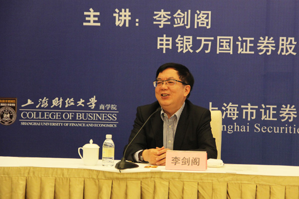5月24日,申银万国证券股份有限公司董事长、孙冶方经济科学基金会理事长李剑阁先生应邀做客上财商学院金融家俱乐部第54期主题沙龙,解读中国当前的资本市场改革。本期沙龙由上海财经大学商学院和上海市证券同业公会联合主办,原工商银行上海分行行长沈若雷先生主持,上海财经大学副校长兼商学院院长孙铮教授、商学院副院长骆玉鼎教授与七十余位金融界高管出席活动。