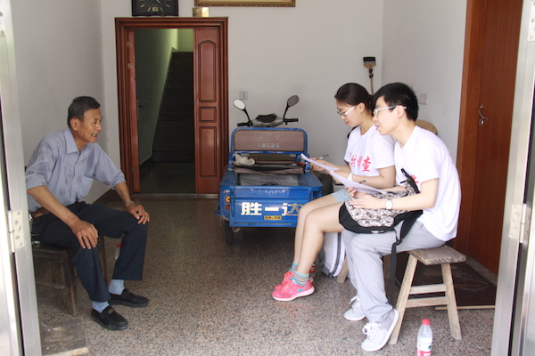 葛玉翔与兰彦慧决定采取交叉访问的形式,保证被访者的积极性。访谈开始,葛玉翔负责提问,兰彦慧则在一旁负责根据丁大爷的作答填写问卷。初始时,葛玉翔的提问方式仍然没法脱离问卷,而显得比较书面。丁大爷回答问题往往还需要葛玉翔详细解释,一轮交换过后,他开始调整策略,提问变得通俗易懂,丁大爷回答起来也更加顺畅。由于年龄偏大,丁大爷对金融知识并不了解,问起每个月去银行几次,老大爷一脸笑容说“至少一次,要领工资啊!”谈及现在的生活,“国家政策好啊,像我这样上了60岁的人每个月都是可以领养老金的。”丁大爷的儿子与媳妇在外打工,二老靠他与老伴的退休金生活,大爷对现在的生活很满意。时间不知不觉过去,丁大爷的热情对待与队员们精心的前期准备让整个访谈进行的非常顺利,两位队员也松了一口气。