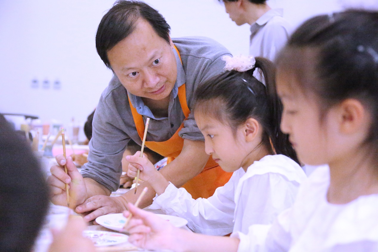 当日下午,艺术中心的陶艺工作坊充满了欢声笑语。在专业陶艺师的指导下,孩子们开始学习如何用手中的画笔和颜料,在陶盘上描绘出心中所想的图案和色彩。