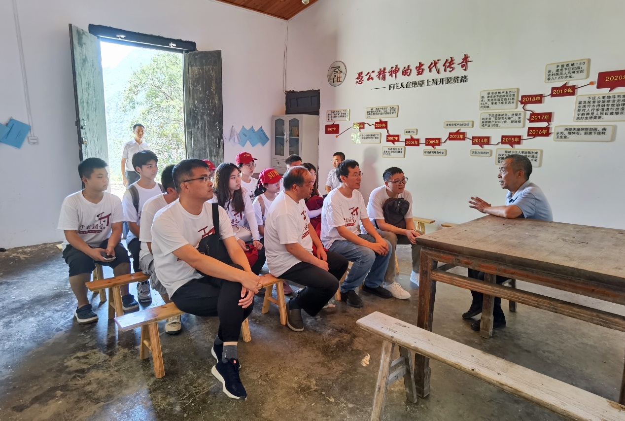 随后,毛相林书记在“愚公讲堂”与调研团全体师生开展座谈会,带领我们一道回忆了当年修路的坎坷与艰辛,又向我们介绍了下庄村近几年的产业发展。脱贫攻坚背后的故事让师生们深受感动。在全国脱贫攻坚总结表彰大会上,习近平总书记也肯定了下庄精神:“带领乡亲们历时7年在绝壁上凿出一条通向外界道路的重庆市巫山县竹贤乡下庄村党支部书记毛相林说:‘山凿一尺宽一尺,路修一丈长一丈,就算我们这代人穷十年苦十年,也一定要让下辈人过上好日子‘。” 毛相林书记带领下庄人民展现出的下庄精神,将一直激励我们。