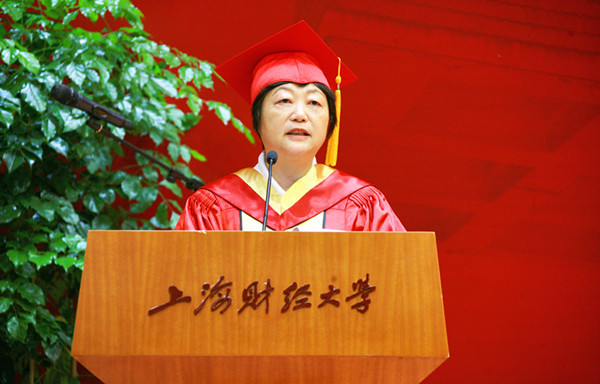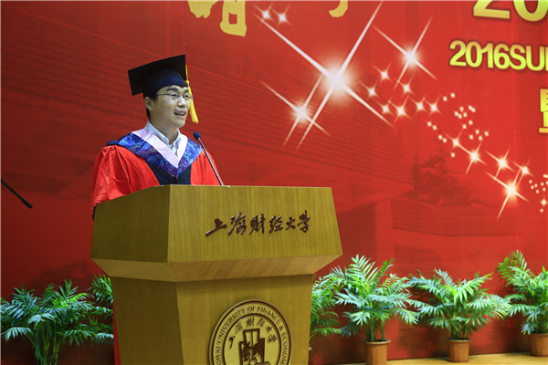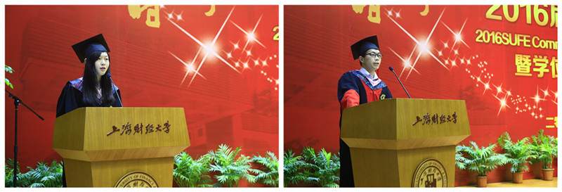 毕业生代表公共经济与管理学院本科生朱莹莹、金融学院博士研究生吴文生分别发言。他们与毕业生一起回顾了自己的大学生活,表达了对母校的感激与眷恋和对老师与同学的感恩与祝福,并与同学们相约财大百年校庆再聚首。他们还代表毕业生们承诺,无论面对何种抉择,身处顺境或逆境,都将秉承“厚德博学经济匡时”的校训,怀揣梦想一路前行,勇于、乐于、敢于承担起国家、民族、社会和家庭的责任,努力成为国家之栋梁,社会之脊梁,母校之荣光。