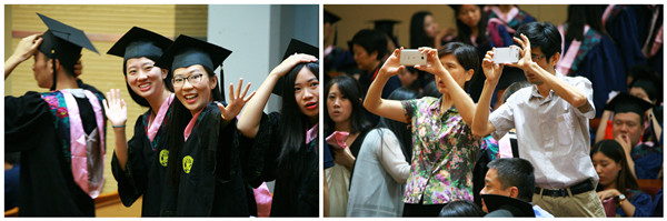 校长樊丽明在创业中心报告厅主会场为3504名毕业生逐一颁发毕业证书,同时各学院(所)院长(所长)宣读毕业生名单,樊校长亲切地与每一位毕业生合影、留念,仪式在喜悦、温馨的气氛中落下帷幕。