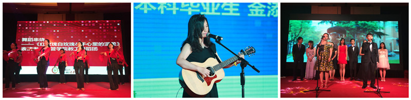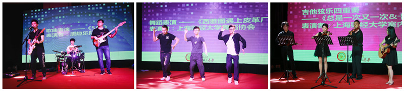 随后,晚会上演了多个精彩的文艺节目。唐趣乐队的一首《say》点燃了全场的热情,上财舞协《西海岸遇上皮革厂》、室内乐团《提琴四重奏》等表演和现场游戏、微信抢红包、抽奖等活动使得晚会精彩纷呈、亮点迭出。学院教工舞蹈协会带来的《红玫瑰白玫瑰》、《手心里的温柔》两支舞蹈以及学院教师应邀上台与新疆少数民族学生共同表演的维吾尔族舞蹈,赢得了同学们的阵阵喝彩,将晚会气氛推向高潮。金添同学自弹自唱由自己创作的歌曲《我用四年写思念》和李金申同学的独舞再次引爆全场。鲍语嫣同学的艺术体操与学院2012届校友何家诚小提琴演奏的完美组合,将全场气氛再次推向高潮。最后,晚会在主题MV的背景和同学们现场演绎的《凤凰花开的路口》歌声中落幕。