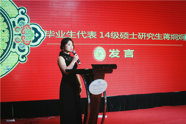 2014级税收政策与管理专业硕士研究生蒋炯炯代表全体毕业生发言,向母校和老师们表示衷心的感谢和崇高的敬意,表达了毕业生们回报学校、回报社会的决心,并祝愿老师桃李满疆,祝愿母校和学院蓬勃发展、再创辉煌!
