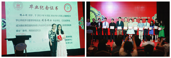 学院税收系系主任任晓辉为2016届税务硕士毕业生代表杨小利颁发“上财君昌税务硕士”毕业纪念证书。学院党总支书记沈晖与学院校友会会长周伟明共同为热心校友工作的12名毕业生颁发了“校友联络大使”聘书。