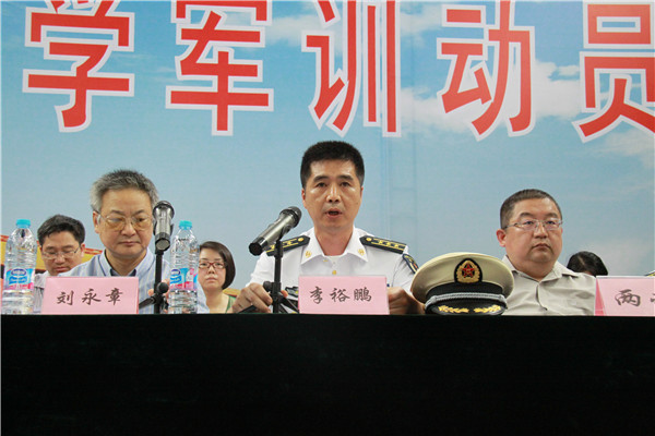 会上,军训团团长宣布了2015级本科生军训训练计划。教官代表和学生代表分别代表训练双方做了发言。教官代表表示,全体教官一定会在训练中,认真履行职责,悉心指导。学生代表表达了刻苦训练、圆满完成训练任务的决心。91150部队副司令员李裕鹏上校作了军训动员报告,他从当代大学生肩负的时代使命和承载的历史重任诠释了军事训练对本科生国防教育的重要意义,军事训练不仅仅是对大学生军事素养的一种培养,更是国防教育的重要一课。通过军事训练,同学们能加深理解什么是责任担当,什么是无私奉献,从而为实现中国梦强军梦而努力奋斗。