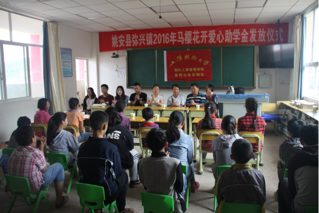 在活动的第三天中午,“2016年马樱花开爱心助学金发放仪式”在弥兴小学的四年级教室里举行,仪式依次由姚安县团委书记、“马樱花开”团队学生代表和弥兴小学校长发言,并现场递交协议、领取助学金,将来自上海的爱心人士的捐款发放到了受助的孩子们手中。整个仪式流程正规,内容完备,助学金交付时多方见证,确保了活动的透明性和公开性,也切切实实地将爱心传递到了真正需要帮助的孩子们的手中。