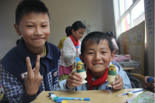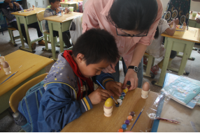 破冰课上,击鼓传气球和萝卜蹲的游戏让队员们和四年级的小朋友们迅速打成一片,在欢快的气氛中彼此熟络起来;密码课上,胡怡青同学用生动形象的方式介绍了摩斯密码,孩子们活学活用,纷纷举手上台表演让大家来猜自己创立的密码;手工课上,孩子们拿起手中的画笔,蘸上五彩的颜料在道具鸡蛋上涂画着,不一会儿形态各异的彩鸡蛋就降生在了孩子们稚嫩童真的画笔下;音乐课上,教室里不时传来清脆响亮、韵律起伏的童声,“虫儿飞,虫儿飞,你在思念谁”的歌声在校园里久久飘荡。