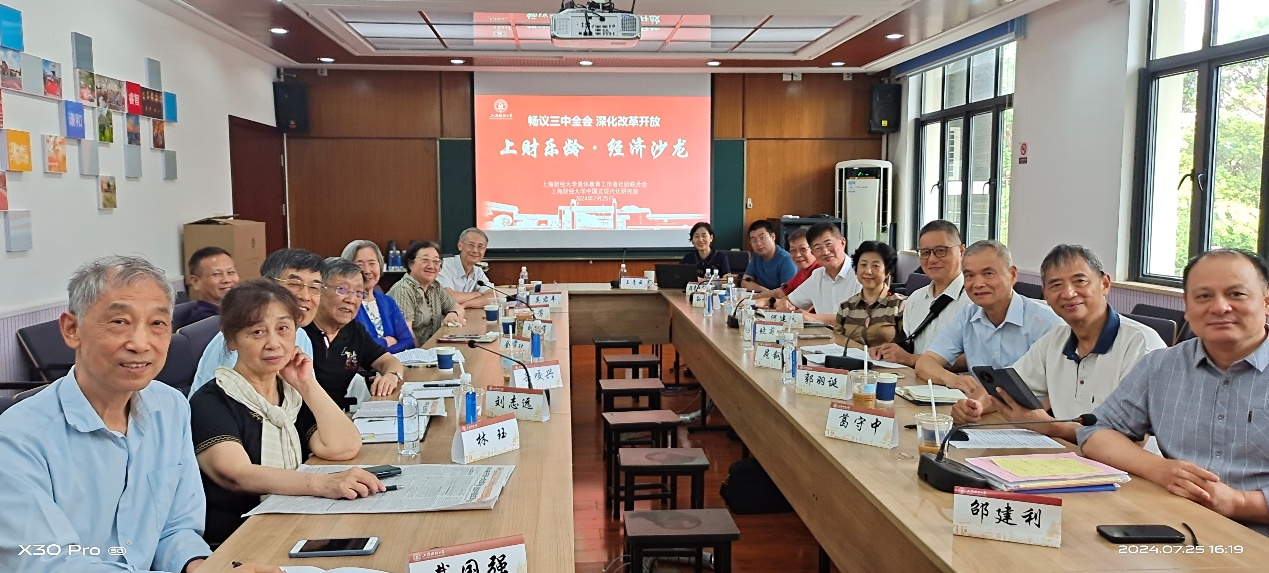 7月25日下午,在党的二十届三中全会胜利闭幕之际,上海财经大学退休教师社团联合会、中国式现代化研究院以“畅议三中全会,深化改革开放”为主题,联合举办老专家老教授“上财乐龄·经济沙龙”。我校经济、金融、财政、贸易、旅游、消费等领域15名退休专家教授晁钢令、戴国强、何建民、孙元欣、赵晓菊、刘志远、奚君羊、林珏、陶婷芳、郭羽诞、刘荔娟、岳咬兴、葛守中、金德环、邵建利参会,畅谈了对二十届三中全会决定的理解和体会,共议深化改革开放,建设中国式现代化的强国之策。未到会的退休专家教授胡怡建、王惠玲提供了书面发言。上海市商务老干部活动中心教育培训专员颜秉涛受邀参加。校离退休工作处处长王青云、中国式现代化研究院谭惠灵参加会议。活动由我校退休教师社团联合会会长晁钢令教授主持。