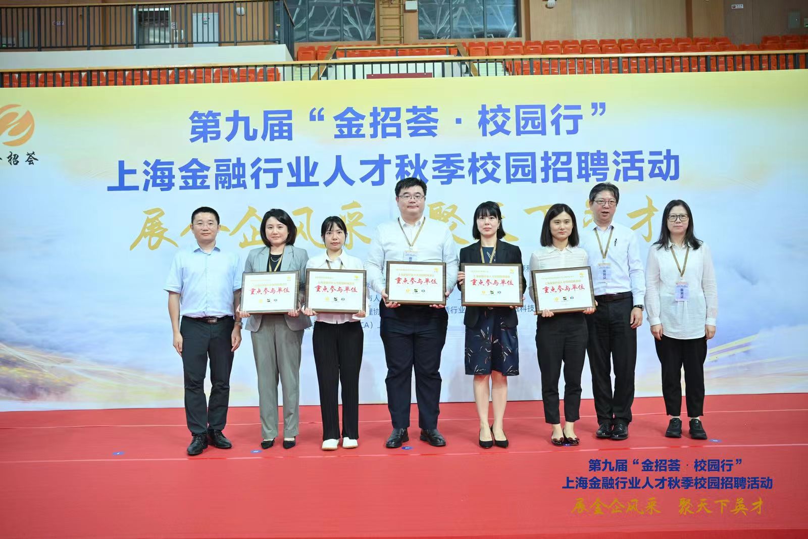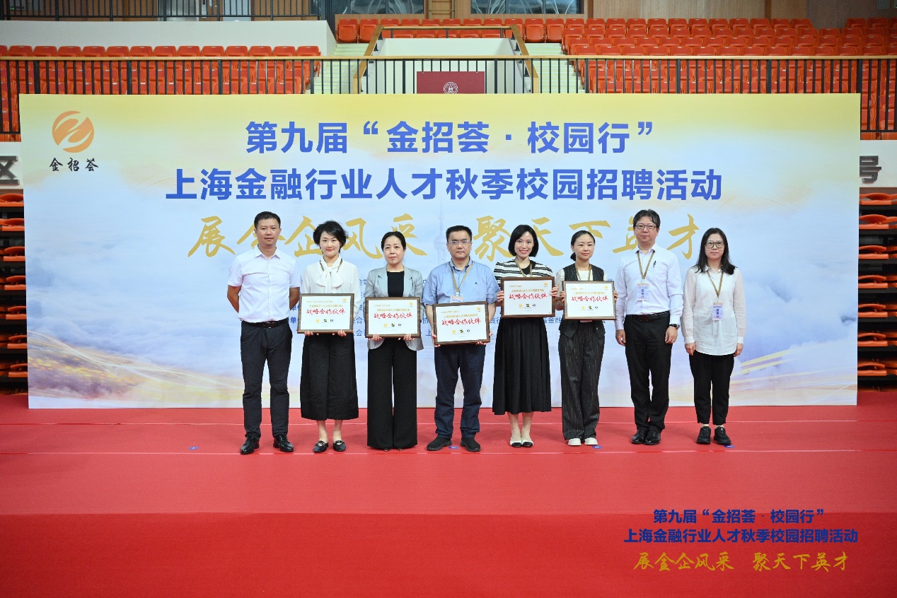 下午13点整,“金招荟”上海金融行业人才秋季校园招聘活动启动仪式开始。启动仪式由上海市金融发展服务中心副主任黄敏主持,上海财经大学党委副书记朱鸣雄、上海市金融发展服务中心主任朱培隽分别在启动仪式上发表致辞。主办方现场授予上海金融业联合会、上海资产管理协会等5家单位 “战略合作伙伴”称号,授予中国工商银行、中国建设银行上海分行等10家单位 “首批重点参与单位”称号。
