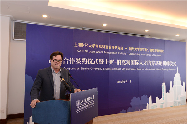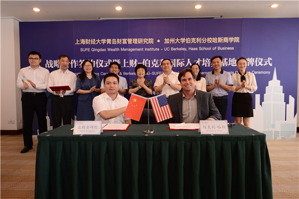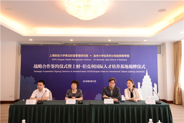8月11日上午,上海财经大学青岛财富管理研究院和美国加州大学伯克利分校哈斯商学院在青岛举行战略合作签约仪式暨“上财(青岛)-伯克利(哈斯)国际人才培养基地”揭牌仪式。我校校长樊丽明,青岛市委常委、副市长王广正出席活动并致辞。此次活动由青岛财富管理研究院院长戴国强主持,加州大学伯克利分校哈斯商学院副院长Michael Rielly (迈克尔·里利)、青岛财富管理研究院执行院长姜晖在签约仪式上先后发表了简短讲话。