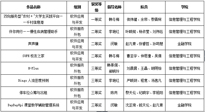 在领队和指导老师的帮助下,我校学生参加了本届大赛软件应用与开发类、软件服务外包类等2个大类的角逐,经过小组答辩、展示作品等环节,由组委会审议确定获奖等级。最终,韩冬梅老师指导、信息管理与工程学院的余帝、侯炜健、黎晋轲同学制作的《双向服务型"农村+"大学生实践平台——千村信息港》荣获国家一等奖。综合考评学校参赛人数和获奖情况,我校总成绩名列前茅。