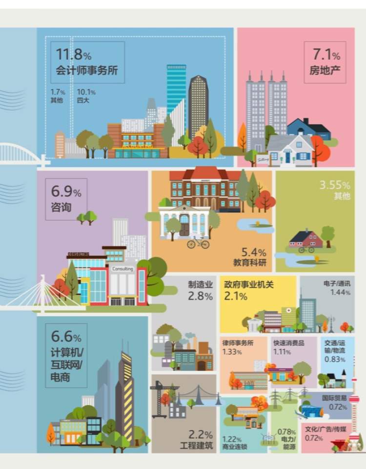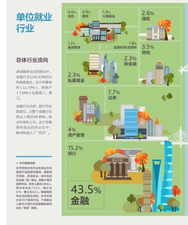 2018届毕业生的就业中,金融行业以43.52%的比例高居首位,会计师事务所(11.79%)、房地产(7.09%)位居第二、第三。